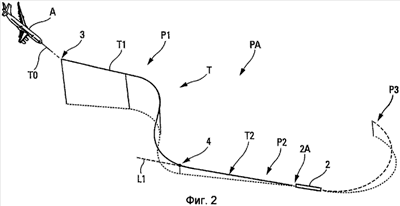 – заключительный этап P2, определенный между точкой 4 перехода и приземлением на взлетно-посадочную полосу 2, во время этого этапа летательный аппарат A ведется вдоль по меньшей мере одной линии L1 захода на посадку, схематично изображенной на фиг.2.