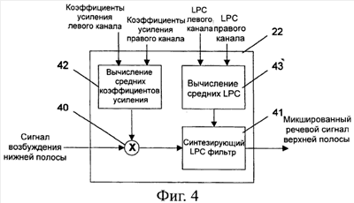 Параметры верхней частотной полосы включают в себя соответственно коэффициент усиления левого канала, коэффициент усиления правого канала, LPC коэффициенты левого канала и LPC коэффициенты правого канала. В блоке 42 вычисления среднего коэффициента усиления соответствующие коэффициенты усиления для левого и правого каналов усредняются, усредненный коэффициент усиления используется смесителем 40 для масштабирования сигнала возбуждения нижней полосы. Полученный сигнал поступает для фильтрации на синтезирующий LPC фильтр 41.