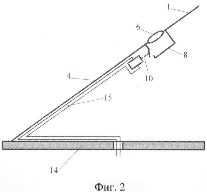 В предпочтительном варианте выполнения антенны выключатели 10 и 11 выполнены с возможностью дистанционного управления. На фиг.2 представлена часть антенны, содержащая выключатель 10, выполненный в виде электромагнитного реле, и провода 15 управления, уложенные по оттяжке 4. Остальные обозначения на фиг.2 такие же, как на фиг.1. На фиг.2 показано схематически, что провода 15 управления уложены вдоль оттяжки. Реально провода управления уложены непосредственно на оттяжку так, что экран проводов управления имеет гальванический контакт с оттяжкой 4 по всей ее длине от выключателя 10 до нижнего конца оттяжки 4. Далее провода 15 управления уложены по поверхности крыши 14 или по проводам металлизации (высокочастотного заземления) также с образованием гальванического контакта между экраном проводов 15 управления и проводящей поверхностью 14. Выключатель 11 (фиг.1) и провода управления для него выполнены аналогично. При мощности передатчика порядка 1 кВт и выше выключатели 10 (фиг.1 и 2) и 11 (фиг.1) могут быть выполнены в виде мощных высокочастотных вакуумных реле. Управление переключателями 10 и 11 может быть выполнено автоматическим, связанным с выбором рабочей частоты передатчика.