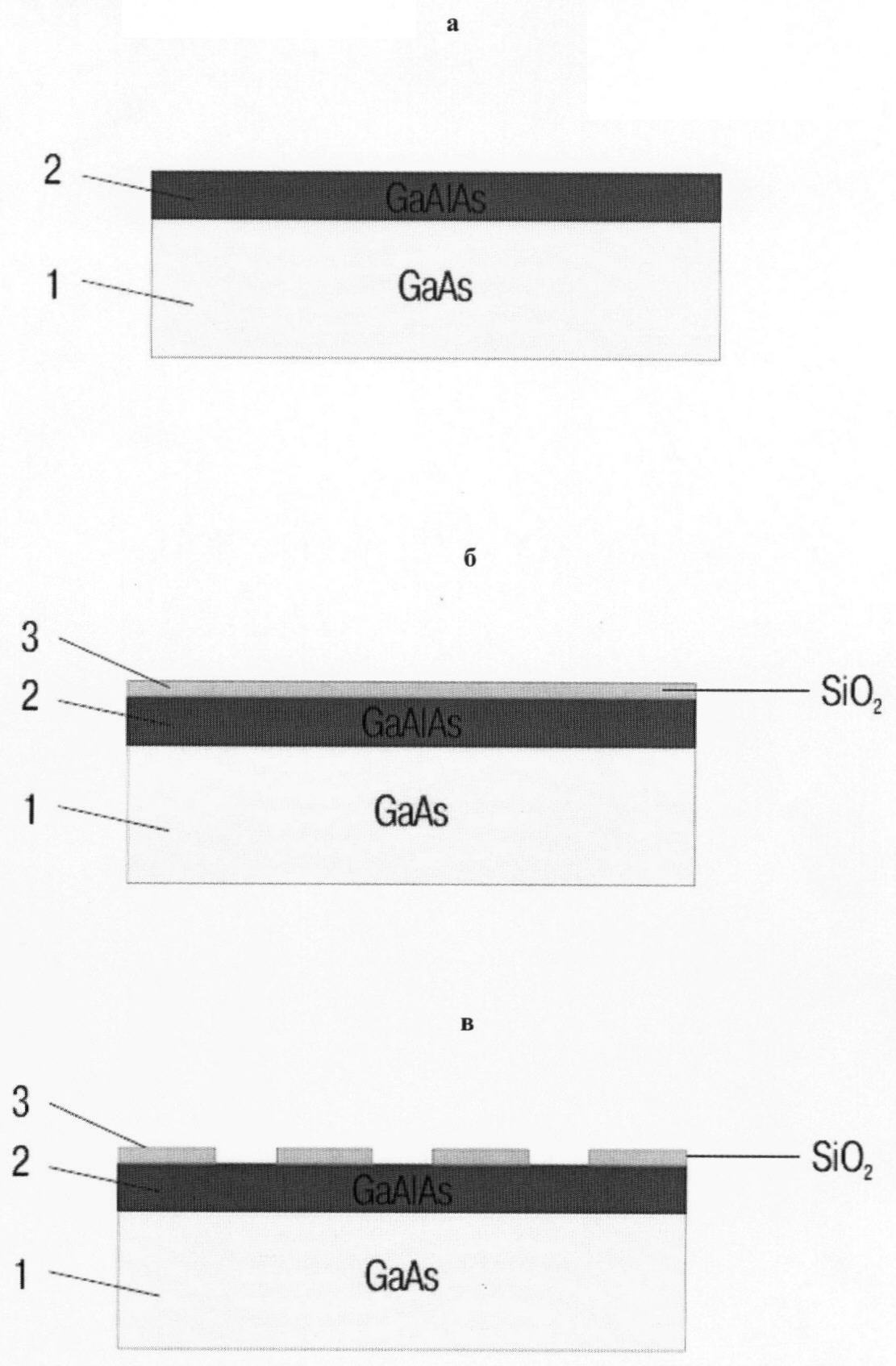 в – выполнения фотолитографии и химического травления через окна в фоторезисте окисла до поверхности GaAlAs,