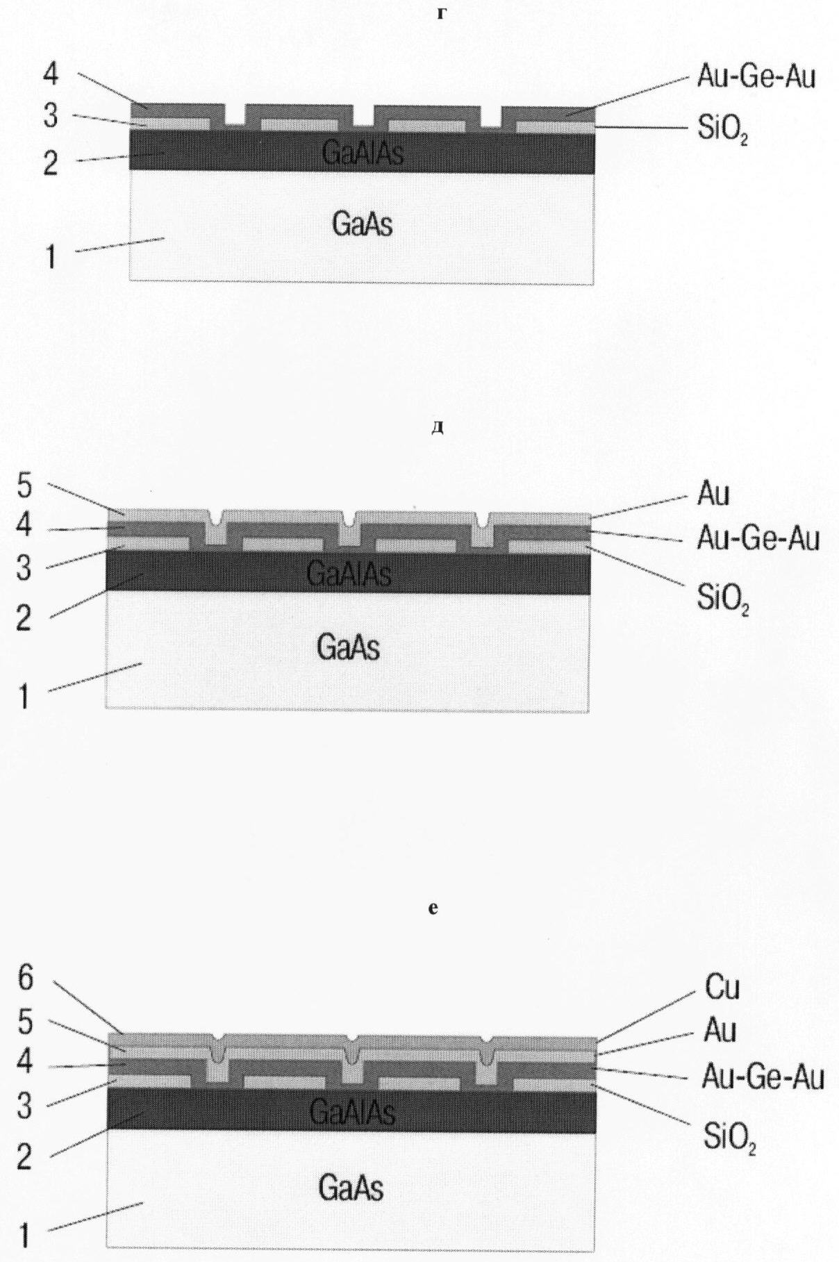 г – напыления слоев Au-Ge-Au (4) для омических контактов и вжигания их,