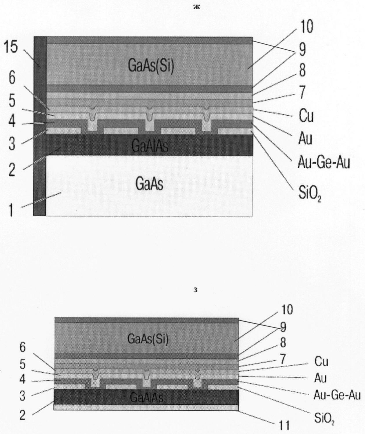 На чертеже, з представлена структура после удаления ростовой подложки (1) и нанесения окисла SiO2 (11) на освободившуюся поверхность GaAlAs-p-n-гетероструктуры (2).