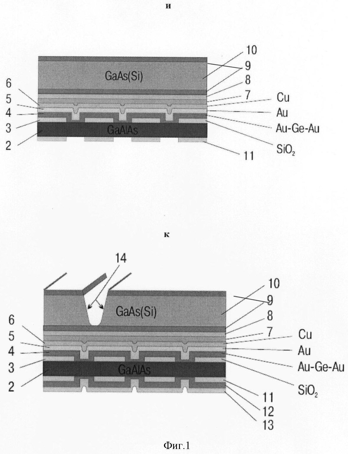 На чертеже, к представлены операции формирования омических контактов (12) после второй фотолитографии, напыления слоя золота (13) на контактные металлы (12), а также скрайбирования структуры (14) в двух взаимно перпендикулярных направлениях со стороны подложки-носителя, для последующего разделения полученной структуры на отдельные излучающие чипы путем разлома гетероструктуры по линиям скрайбирования (14).