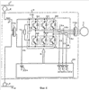 На фиг.4 показана блок-схема, иллюстрирующая преобразователь электроэнергии в соответствии с технологией 1 как основы настоящего изобретения; на фиг.4 иллюстрируется пример преобразователя электроэнергии, установленного в электрическом транспортном средстве. На фиг.4 мощность постоянного тока подают из подвесной контактной линии 1 в преобразователь 6 электроэнергии, установленный в электрическом транспортном средстве, через токосниматель 2. Переключатель (не показан) и сглаживающая цепь, выполненная на основе дросселя 3 и конденсатора 12, соединены с токоснимателем 2. В модуле 13b обратного преобразователя как схемы обратного преобразователя предусмотрена трехфазная мостовая схема, выполненная с переключающими устройствами SU, SV, SW, SX, SY и SZ; выводы на стороне постоянного тока, сформированные из его проводников на стороне входа, соединены с конденсатором 12, и выводы на стороне переменного тока для фазы U, фазы В и фазы W, сформированные из его проводников на стороне выхода, соединены с соответствующими входными выводами трехфазного двигателя 7 переменного тока (ниже называется двигателем), который приводит в движение электрическое транспортное средство.