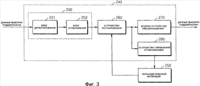 Как проиллюстрировано на фиг.3, эквалайзер 240 в соответствии с настоящим вариантом осуществления включает в себя первое устройство 250 преобразования, устройство 260 регулирования, второе устройство 270 преобразования и устройство 280 управления отображением. Первое устройство 250 преобразования включает в себя блок 251 детектирования и блок 252 отображения.