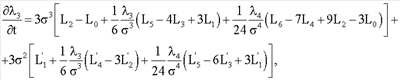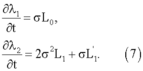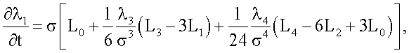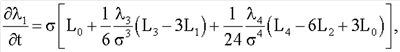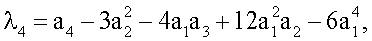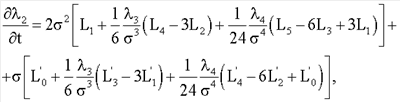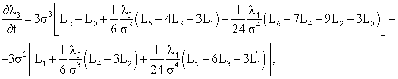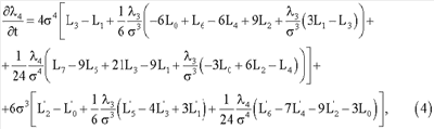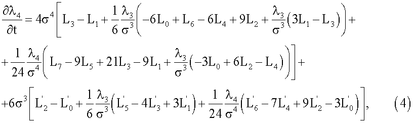 Дифференцируя (3) по z k раз с учетом (2) и представив плотность вероятности p(t, x) рядом Эджворда, можно получить уравнения для кумулянтов. В качестве примера выпишем систему уравнений для четырех кумулянтов, приняв гипотезу о том, что кумулянты процесса x(t) порядка выше четвертого равны нулю