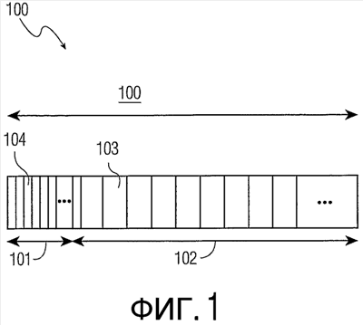 В протоколе распределеного MAC время делят на суперкадры 100, как показано на фиг.1. В начале каждого суперкадра 100 существует интервал/фаза маяка, также известный как период маяка (ПМ) 101, который сопровождается интервалом/фазой передачи данных 102. В самой общей структуре суперкадра суперкадр может также содержать больше одного ПМ. Суперкадр, кроме того, делится на определенное количество слотов доступа к среде передачи (СДСП) 103. В ПМ 101 СДСП 103 подразделяют на определенное количество слотов 104 маяка, например 3 слота маяка в СДСП 103. ПМ 101 может содержать переменное количество СДСП 103, т.е. слотов 104 маяка, но не может быть длиннее определенной максимальной длины. Слоты маяка и СДСП отделяются с помощью охранных временых интервалов для учета погрешностей синхронизации и задержек передачи сигналов.