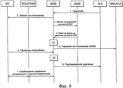 На фиг.6 показан пример процедуры разъединения, к которой приступает опорный регистр местоположения HLR для деактивизации PDP контекста. Опорный регистр местоположения использует эту процедуру для определяемых оператором целей при удалении абонентских контекстов управления мобильностью (ММ) и PDP в SGSN узле.