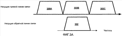Фиг.3А и 3B иллюстрируют примеры асимметричного назначения несущих. Фиг.3А показывает три несущих 300A-300C прямой линии связи и одну соответствующую несущую 302 обратной линии связи. Фиг.3B показывает три несущих 300A-300C прямой линии связи и две соответствующих несущих 304A, 304B обратной линии связи. Асимметричное назначение несущих может использоваться для приложений с асимметричными требованиями к скорости передачи данных, таких как загрузка по протоколу передачи файлов (FTP). Асимметричное назначение несущих может иметь (a) сокращенные накладные расходы обратной линии связи и (b) каналы управления доступом к среде (MAC), которые дают возможность раздельного назначения несущих прямой линии связи для передачи информации (FLT) и несущих обратной линии связи для управления мощностью (RPC).