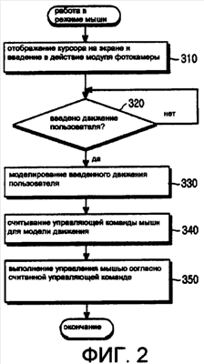 Обращаясь к Фиг. 2: в режиме работы мыши контроллер 150 отображает курсор на экране дисплея 170 и вводит в работу модуль 190 фотокамеры – этап 310. При этом курсор может отображаться или не отображаться. Затем контроллер 150 определяет факт ввода движения пользователя – этап 320. Если движение пользователя введено, то контроллер 150 переходит к этапу 330 и осуществляет управление модулем 180 распознавания движения, чтобы смоделировать движение пользователя. Если модуль 180 распознавания движения моделирует движение пользователя, предоставляемое контроллеру 150, то контроллер 150 на этапе 340 считывает из памяти 160 управляющую команду мыши, соответствующую данной модели движения. Затем контроллер 150 выполняет управляющую команду мыши в соответствии со считанной управляющей командой мыши – этап 350. Например, если пользователь использует движение мыши с щелчком рукой, как если бы пользователь действительно щелкнул мышью, то контроллер 150 выполняет управляющее движение, соответствующее тому варианту, когда пользователь защелкивает позицию в меню или Интернет-пиктограмму, для которых установлен курсор на экране дисплея 170. Если пользователь выполняет движение кручения колеса мыши, как если бы пользователь действительно крутил колесо мыши, то контроллер 150 перемещает курсор на экране дисплея 170 в соответствии с движением поворота колеса мыши.