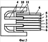 Фиг.5 – вид по стрелке А-А, на котором показан разрез многослойной люминесцентной структуры и вид профильной фильеры.