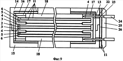 Фиг.9 – поперечный разрез люминесцентной панели и вид на соединение контактов с шинами и проводящими слоями соединительных элементов.