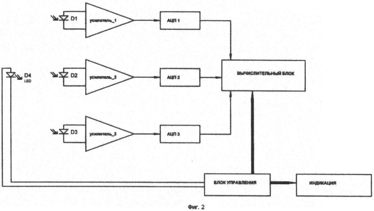 Функциональная схема прибора показана на фиг.1. При работе между излучателем 1 и крышкой помещается лист растения 2. В корпусе прибора расположены светопроводящие каналы 3, представляющие собой раздвоенный металлический патрубок, по одной ветви которого проникший через лист растения свет попадает на фотоэлемент 5, фиксирующий его интенсивность. По другой ветви патрубка свет от листа проходит через фильтр 4 (дифракционную решетку), пропускающий только инфракрасные лучи определенной длины волны, характерной для флуоресценции хлорофилла, которые далее попадают на другой фотоэлемент 6 прибора. Запрограммированное электронное устройство прибора с микрочипом 7, воспринимая электрический ток, поступающий от фотоэлементов, осуществляет необходимую математическую обработку полученной информации и выводит ее на жидкокристаллический монитор 8, расположенный на одной из боковых сторон корпуса. Продолжительность одного измерения составляет несколько секунд. Результат измерения выдается в виде цифр, показывающих соотношение интенсивности флуоресценции хлорофилла к прозрачности листьев растений и порядковый номер измерения, которые автоматически заносятся в память прибора. При холостом включении светодиода на мониторе высвечивается цифра, указывающая уровень его светосилы, зависящий от степени разрядки пальчиковых батарей. На корпусе прибора расположен пульт управления в виде кнопок, позволяющих в оперативном режиме включать и выключать светодиод, сбрасывать ненужные (ошибочные) результаты измерения, усреднять результаты серии измерений и давать команду на их сброс.