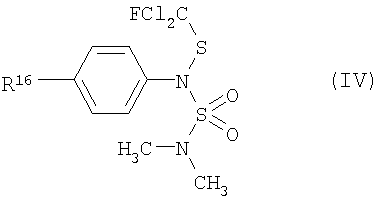 где Q – водород или SH, m = 0 или 1, R11 – водород, фтор, хлор или фенил, R12 – водород или хлор, А4 – простая химическая связь, -СН2-, -(СН2)2 или -О-, А5 означает С, R13 – водород, гидрокси, R14 – 1-хлорциклопропил, (С1-C4)-алкил, (С1-С6)-гидроксиалкил, R13 и R14, кроме того, вместе означают -O-CH2-CH(R15)-O- или -О-СН(2-хлорфенил)-, R15 – (С1-С4)-алкил; группа (4) сульфенамида общей формулы (IV)
