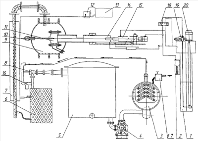 Вакуумный коптильный агрегат, показанный на схеме, имеет следующие основные элементы: маслонасосная установка 1 (составляющими управляющими узлами которой в свою очередь являются электродвигатель 20, гидроаккумулятор 2, редукционный клапан 19, электрогидрораспределитель 18), которая входит в состав дымогенератора 9 (основные составляющие – патрубок подачи свежего воздуха 10, перфорированная головка 11, поршень 14, гидроцилиндр 15). Ресивер для накопления дыма дымогенератора патрубками связан с охладителем дыма 7, затем дымопровод идет к фильтру 6, дым с фильтра поступает через пассивное сопло в эжектор 8, далее в камеру копчения 5 и к водокольцевому насосу 4. Нагнетательная сторона насоса соединена с накопительным конденсатором 3. В накопительном конденсаторе предусмотрен перепускной клапан 17. Для подачи свежего воздуха предусмотрен воздухонагнетатель 13 с регулятором производительности 12. В дымопроводе, соединяющем газовую полость конденсатора 3 с активным и пассивным соплом эжектора, предусмотрен клапан управления потоком дыма 16. Питательный аппарат горючего материала дымогенератора в схеме не показан. В вакуумном коптильном комплексе рабочий процесс происходит следующим образом. При включенных нагревателях дымогенератора и полностью заправленном горючем материале в перфорированной головке 11 горючий материал начинает тлеть и выделяется дым, заполняет ресивер 9 дымогенератора, оттуда дым отсасывается через технологические аппараты (охладитель дыма, фильтр, эжектор, камера копчения ) водокольцевым насосом 4 и нагнетается вместе с рабочей средой насоса (вода) в накопительный конденсатор. В емкостном пространстве конденсатора рабочая жидкость отделяется от дыма и накапливается в нижней части емкости, а дым накапливается в верхней части емкости, при необходимости обе среды охлаждаются энергией хладоносителя (проточной воды, протекающей в трубках конденсатора). Накопленная рабочая среда забирается водяным насосом и подается на подпитку водокольцевого насоса. Одна часть накопленного дыма в конденсаторе направляется за счет разности давлений в эжектор, другая часть, в случае если давление в конденсаторе превышает установленную величину, через перепускной клапан 17 выпускается на утилизацию. Водокольцевой насос создает по всей длине технологической цепи вакуум. При высоком вакууме значительно уменьшается производительность вакуумного насоса, что позволяет регулировать расход горючего материала в широких пределах. В зону горения дымогенератора воздух подается только через компрессор 13 и регулятор производительности 12 в строго дозированном количестве или при необходимости вообще прекращается доступ воздуха, ибо камера дымообразования прессового дымогенератора полностью герметична, гильза для подачи свежей порции горючего материала также герметична из-за того, что горючий материал находится в прессованном состоянии под действием подпора поршня 14, который в свою очередь находится под подпором штока гидроцилиндра 15 благодаря гидроаккумулятору 2 гидроустановки. Эжектор 8 вмонтирован между фильтром 6 и камерой копчения 5, причем пассивное сопло соединено напрямую с фильтром 6 и через клапан управления 16 с дымопроводом, идущим с верхней части конденсатора. При закрытом клапане 16 отсасываемый насосом 4 дым посл