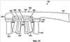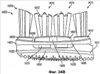 Как рассмотрено со ссылками на вариант исполнения, изображенный на Фиг.7 и 8, чистящие элементы 12218, закрепленные на центральных площадках, могут быть приспособлены к вхождению в контакт с зубами, деснами и другими поверхностями полости рта пользователя различными путями, что является преимуществом их конфигураций с гибкими опорами. Например, как изображено на Фиг.19, чистящие элементы, которыми снабжены центральные площадки, могут содержать передние элементы 12090, наклоненные к заостренному концу головки, и задние элементы 12092, наклоненные к ручке. Благодаря такому расположению и ориентации этих передних и задних элементов можно увеличить вероятность того, что такие элементы будут входить в контакт с поверхностью, подлежащей чистке до того, как другие чистящие элементы на соответствующих площадках соприкоснутся с ними, таким образом вынуждая соответствующие площадки изгибаться, когда остальные чистящие элементы на ней входят в контакт с поверхностью.