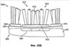 Как изображено на Фиг.3 и 4, каждое основание 616 и 620 и каждая площадка 622 и 624 могут иметь, в общем, овальную наружную поверхность. Основания и площадки выровнены вдоль оси в продольном направлении, но отделены друг от друга углублениями, или незаполненными областями, образующими каналы 728. Как также изображено на Фиг.3, площадки могут иметь большую наружную поверхность или поверхность, несущую чистящие элементы, чем основания.