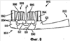 Как было указано выше, на Фиг.2 изображены торцевые поверхности чистящих элементов 618 и 626, выполненные клинообразно и направленные вверх и вниз или зигзагообразно. На Фиг.5-6 изображен альтернативный способ выполнения клинообразных поверхностей, где торцевые поверхности образуют ровную, мягкую, вогнутую поверхность. Могут быть образованы и другие формы, если это желательно, например, плоская форма или выпуклая форма торцевых поверхностей, а также зигзагообразная форма или клинообразная форма, где поверхности направлены вверх и вниз, как это изображено на Фиг.2. Аналогично этому торцевые концы чистящих элементов в варианте исполнения, изображенном на Фиг.1-4, а также изображенном на Фиг.5-6, могут иметь различные формы, например зигзагообразную, выпуклую, вогнутую или плоскую.