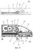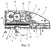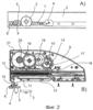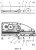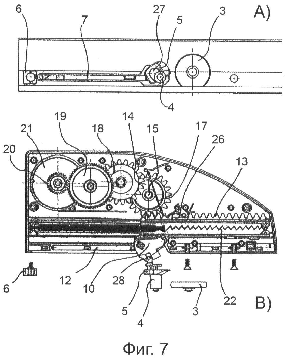 На фиг.7А и 7В показано начало движения закрытия. Палец 4 перемещается в гнезде 27 на приводном механизме 5, в результате чего приводной механизм 5 поворачивается книзу и может переместиться в пазовой направляющей 7 в начальное положение в сторону стопора 6. Кроме того, переходник 10 также поворачивается посредством приводного механизма 5, чтобы затем переходник 10 мог аналогично переместиться в начальное положение в пазовой направляющей 12.