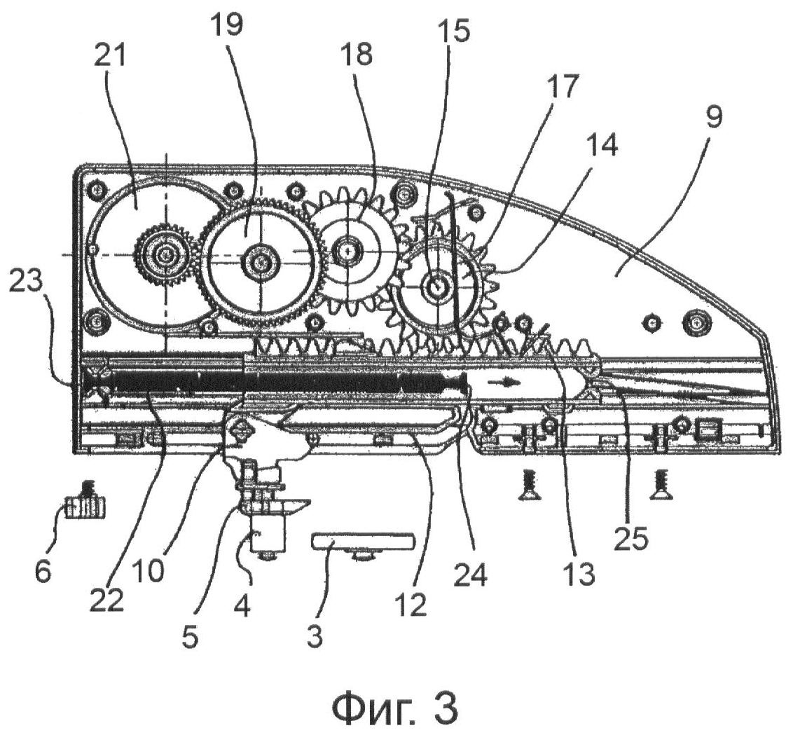 Движению переходника 10 и приводного механизма 5 помогает пружина 22, которая аналогично перемещает зубчатую рейку 13 в начальное положение. Зубчатое колесо 14 свободного хода прижимается посредством зубчатой рейки 13 к соседнему зубчатому колесу 18, поэтому отпадает необходимость в пружине 16 для удерживания зубчатого колеса 14 в зацеплении. Это происходит вследствие того, что соответствующее механическое сцепляющее действие уже обеспечено пружиной 22 и зубчатой рейкой 13.