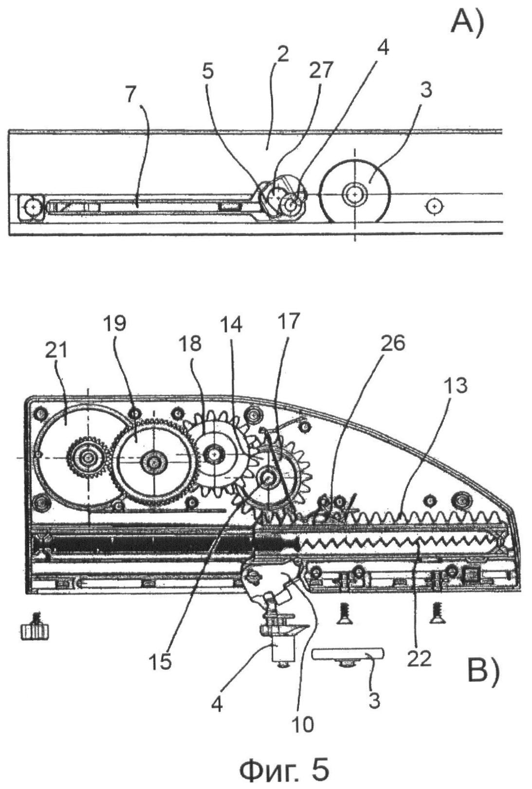 На фиг.2А и 2В показано начальное положение, в котором приводной механизм 5 упирается в стопор 6. К приводному механизму 5 присоединен переходник 10, причем переходник 10 направляется посредством штырька 11 в пазовой направляющей 12, выполненной в корпусе 9 и имеющей изогнутый конец 80, при этом данная пазовая направляющая 12 расположена перпендикулярно пазовой направляющей 7. Переходник 10 также соединен с зубчатой рейкой 13, которая входит в зацепление с зубчатым колесом 14 свободного хода. Зубчатое колесо 14 имеет опорную шейку 15, имеющую ступенчатое плечо и опирающуюся на ножку 17 пружины 16. Ножка 17 пружины 16 может прижимать опорную шейку 15 к сравнительно малому зубчатому венцу зубчатого колеса 18, причем для этого ось зубчатого колеса 14 закреплена с возможностью перемещения. Зубчатое колесо 18 входит в зацепление своим сравнительно большим зубчатым венцом со сравнительно малым зубчатым венцом зубчатого колеса 19. Сравнительно большой зубчатый венец зубчатого колеса 19 в свою очередь приводит в движение зубчатое колесо 20, которое приводит в действие тормоз 21 на вихревых токах. Зубчатые колеса 18, 19 и 20 представляют собой вид зубчатой передачи, посредством которой движение зубчатой рейки 13 передается тормозу 21 на вихревых токах.