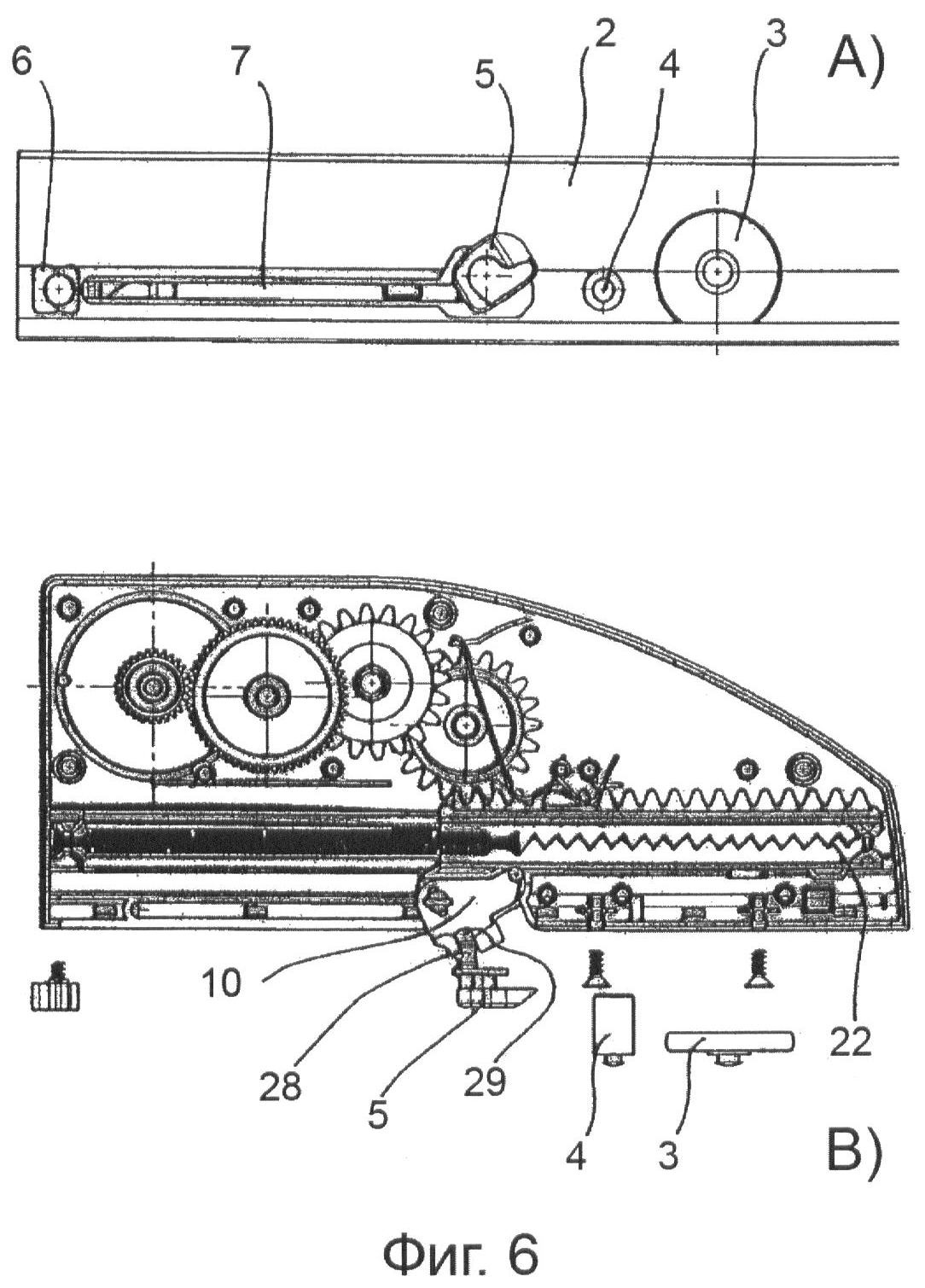 На фиг.5А и 5В показан момент высвобождения пальца 4 таким образом, что демпферное устройство отсоединяется от элемента мебели. Палец 4 движется в сторону от гнезда 27 на приводном механизме 5, причем приводной механизм 5 поворачивается в пазовой направляющей 7. Переходник 10 также поворачивается в пазовой направляющей 12, причем в конечном положении переходник 10 фиксируется в изогнутом конце 80 пазовой направляющей. В конечном положении выступ 26, выполненный на зубчатой рейке 13, надавливает на пружину 16 таким образом, что последняя своей ножкой 17 прижимается к плечу опорной шейки 15 на зубчатом колесе 14, в результате чего зубчатое колесо движется в сторону соседнего зубчатого колеса 18 и входит в зацепление с выполненными на нем зубцами. Зубчатое колесо 14 свободного хода теперь соединено с тормозом 21 на вихревых токах посредством зубчатой передачи 18, 19. Пружина 22, показанная лишь схематично, находится в конечном положении и отжимает зубчатую рейку 13 назад в начальное положение.