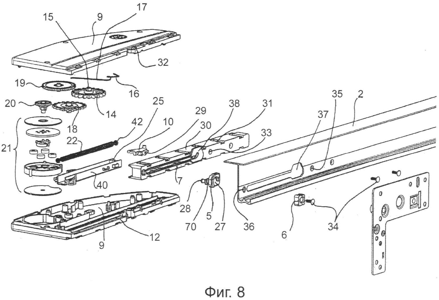 На фиг.8 представлено демпферное устройство в разобранном виде. Приводной механизм 5 содержит гнездо 27 для пальца 4, на противоположной стороне которого имеется штырь 28, входящий в гнездо 29 переходника 10. При этом приводной механизм 5 направляется посредством сужающегося шеечного участка 70 в пазовой направляющей 7, выполненной в основании 30 корпуса. В основании 30 корпуса предусмотрены пазы 31, которые могут входить в зацепление с соответствующими блокирующими выступами 32 на боковой стенке корпуса 9. Кроме того, в основании 30 корпуса предусмотрено несколько отверстий 33, благодаря которым указанное основание 30 корпуса можно привинтить к направляющему рельсу 2. Для этой цели на направляющем рельсе 2 предусмотрено несколько отверстий 35 и 36, а в эти отверстия 35 и 36 можно ввинтить винты 34. Стопор 6 также фиксируется посредством находящегося на концевом участке отверстия 36 и винта 34.