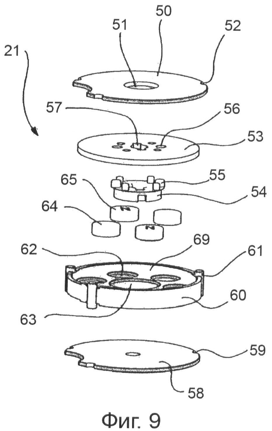В держателе предусмотрена дисковидная пластина 69, в которой с равномерным угловым интервалом выполнены отверстия 62. Отверстия 62 расположены по окружности вокруг центрального отверстия 63, в которое можно вставить опору фиксатора 54. В дисковидную пластину 69 можно вставлять постоянные магниты 64 и 65, причем постоянный магнит с южной полярностью вставляют рядом с постоянным магнитом 65 с северной полярностью поочередно, причем возможно, чтобы идентичные постоянные магниты 64 и 65 вставлялись просто с различной ориентацией. Постоянные магниты 64 и 65 создают магнитное поле, которое проходит через элементы 50 и 58 корпуса, при этом обеспечивается тормозящее воздействие за счет быстрого вращения диска 53, вызванного магнитным полем и вихревыми токами, индуцированными в диске 53.