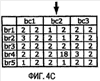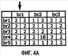 Как можно видеть на фиг.4a, устройство в этом примере содержит три столбца bc1-bc3 устройств разбивания яиц, каждый из которых содержит пять устройств, расположенных в ряд, br1-br5. Большинство из устройств разбивания яиц уронило или не смогло разбить несколько яиц с начала работы устройства, и значение в первом субстолбце было записано соответствующим образом, например разбивающее устройство 1 в ряду 2 уронило или не смогло разбить три яйца. Даже если устройство оптимально функционирует, некоторые яйца неизбежно будут уронены, не разбиты или повреждены вследствие неотъемлемых колебаний натуральных продуктов и того, что яйца являются относительно хрупкими, и поэтому значений 0 не следует ожидать.