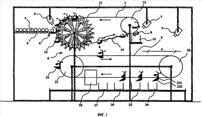 Самая верхняя цепь 1 приводится в движение по направлению против часовой стрелки, а самая нижняя цепь 2 – по направлению по часовой стрелке, что показано с помощью стрелок, при этом скорость двух цепей, по существу, одинаковая. Таким образом, каждое устройство 13 разбивания яиц встретит устройство 23 размещения яиц в точке B, и данная пара будет перемещаться вместе до тех пор, пока не достигнет верхней правой вращающейся звездочки 12, как видно на фиг.1.