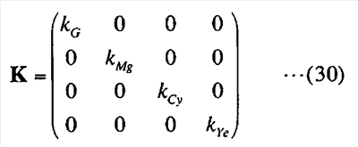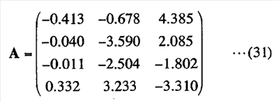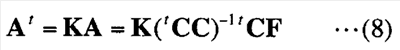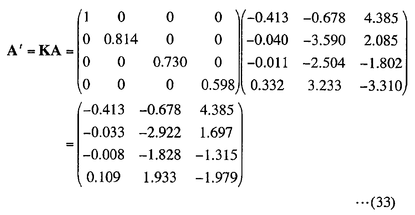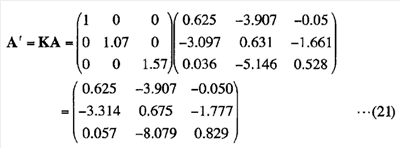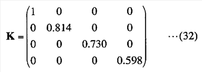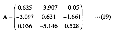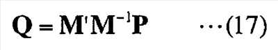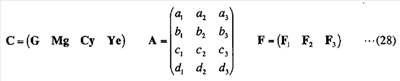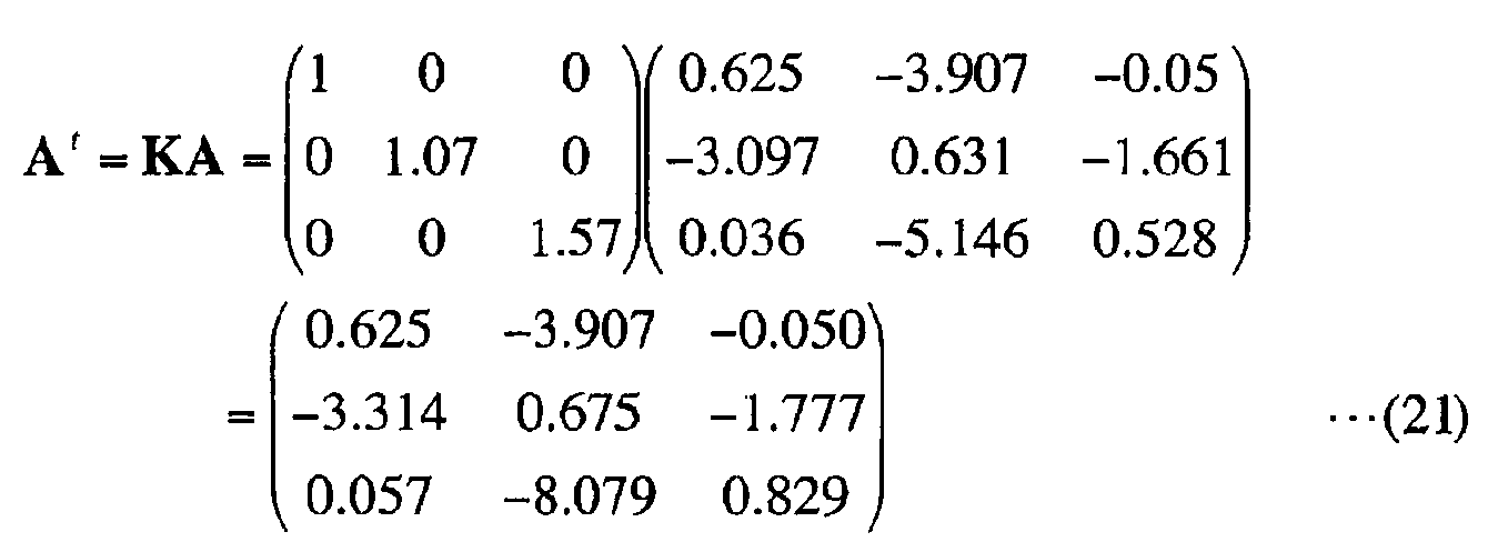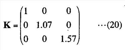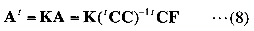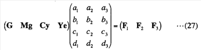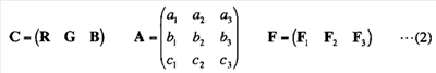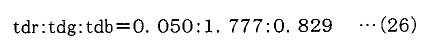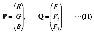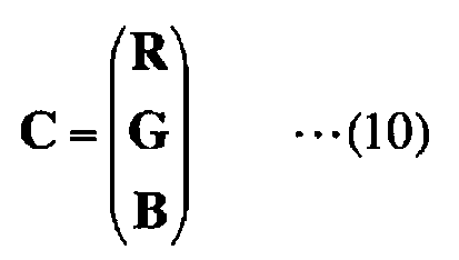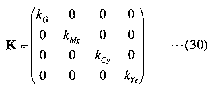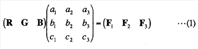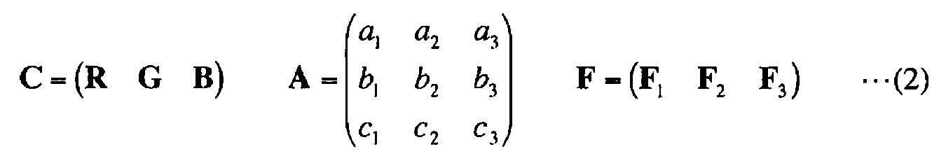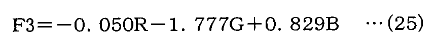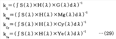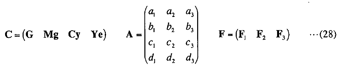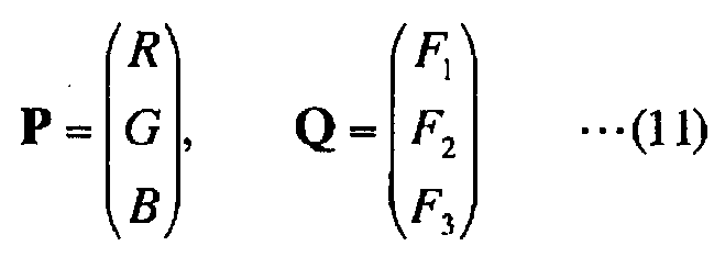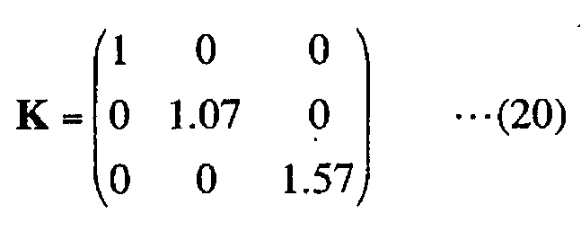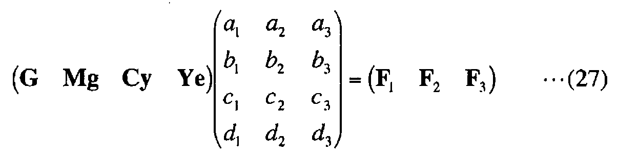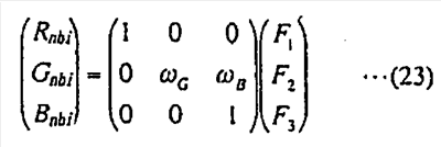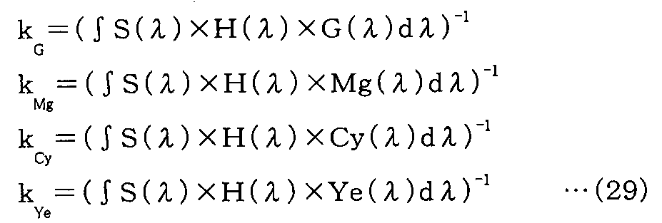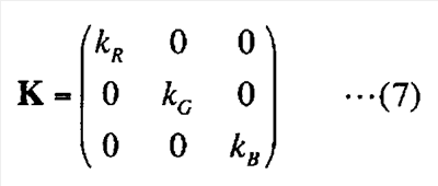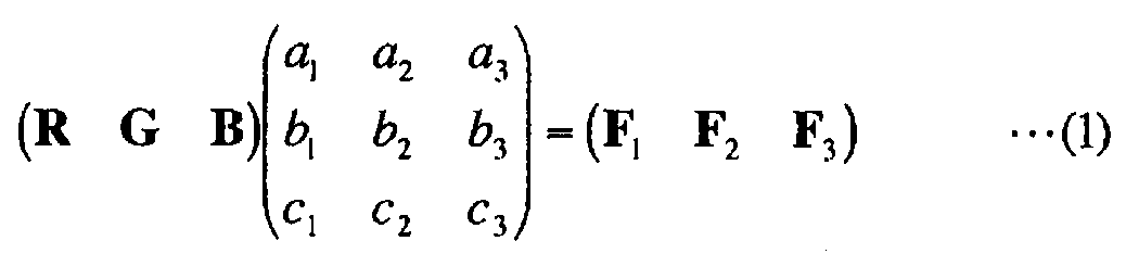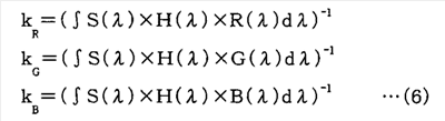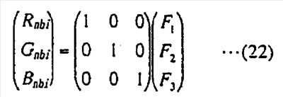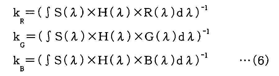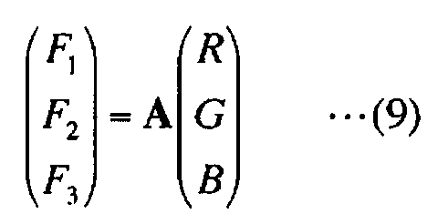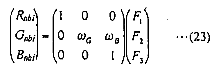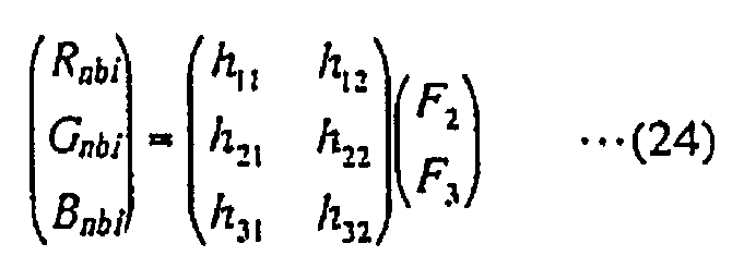 В данном случае, поскольку n>3 справедливо для числа n точек в последовательности, например, спектральных данных, представляющих спектральные характеристики, то формулу 3 получают как решение линейным методом наименьших квадратов вместо системы линейных уравнений. Другими словами, достаточно вывести псевдообратную матрицу из формулы 3. Допуская, что транспонированная матрица от матрицы Поскольку <tCC> является квадратной матрицей n×n, формулу 4 можно рассматривать как систему уравнений на матрице коэффициентов, вследствие чего решение которой можно вычислить из: Преобразованием левой стороны формулы 3 относительно матрицы коэффициентов, заданной формулой 5, электронное эндоскопическое устройство способно аппроксимировать характеристики узкополосных фильтров F1/F2/F3, подлежащих получению. На этом завершается описание способа вычисления матриц, который составляет основу настоящего изобретения. С использованием матрицы, вычисленной таким образом, секция 436 вычисления матриц, подлежащая описанию впоследствии, формирует спектральный сигнал изображения по цветовому сигналу изображения. Посредством обработки сигналов, выполняемой секцией 436 вычисления матриц и т.п., как описано выше, сигналы, соответствующие узкополосным фильтрам F1/F2/F3, подлежащим вычислению (из широкополосного фильтра RGB), становятся спектральным сигналом изображения. Поэтому в нижеописанном варианте осуществления, F1/F2/F3 будут применяться как спектральные сигналы изображения. Кроме того, поскольку F1/F2/F3 как спектральные сигналы изображения соответствуют узкополосным фильтрам, сформированным при обработке электрических сигналов, то существуют ситуации, в которых применяют квазиузкополосный фильтр для точного назначения его характерных спектральных особенностей. (Способ введения поправок) Далее приведено описание способа введения поправок для получения более точного спектрального сигнала изображения. В представленном выше описании способа вычисления матриц способ безошибочно применим в случае, когда световой поток, принимаемый твердотельным устройством съемки изображения, например, CCD (прибором с зарядовой связью), является идеальным белым светом (интенсивности всех длин волн имеют одинаковое значение в видимом диапазоне спектра). Другими словами, оптимальная аппроксимация обеспечивается, когда соответствующие выходные сигналы R (красного), G (зеленого) и B (синего) одинаковы. Однако при эндоскопическом наблюдении в реальных условиях, поскольку подсвечивающий световой поток (световой поток от источника света) не является идеальным белым светом и спектр отражения живого организма также не равномерен, то световой поток, принимаемый твердотельным устройством съемки изображения, также не является белым светом (окрашивание предполагает, что значения R, G и B не одинаковы). Поэтому, при фактической обработке, для более точного решения задачи, выраженной формулой 3, желательно учитывать спектральные характеристики подсвечивающего света и характеристики отражения живого организма в дополнение к характеристикам цветочувствительности RGB. Предположим теперь, что характеристики цветочувствительности имеют вид соответственно R( С использованием данных коэффициентов можно определить поправочные коэффициенты kR/kG/kB из выражений: Матрицу поправочны