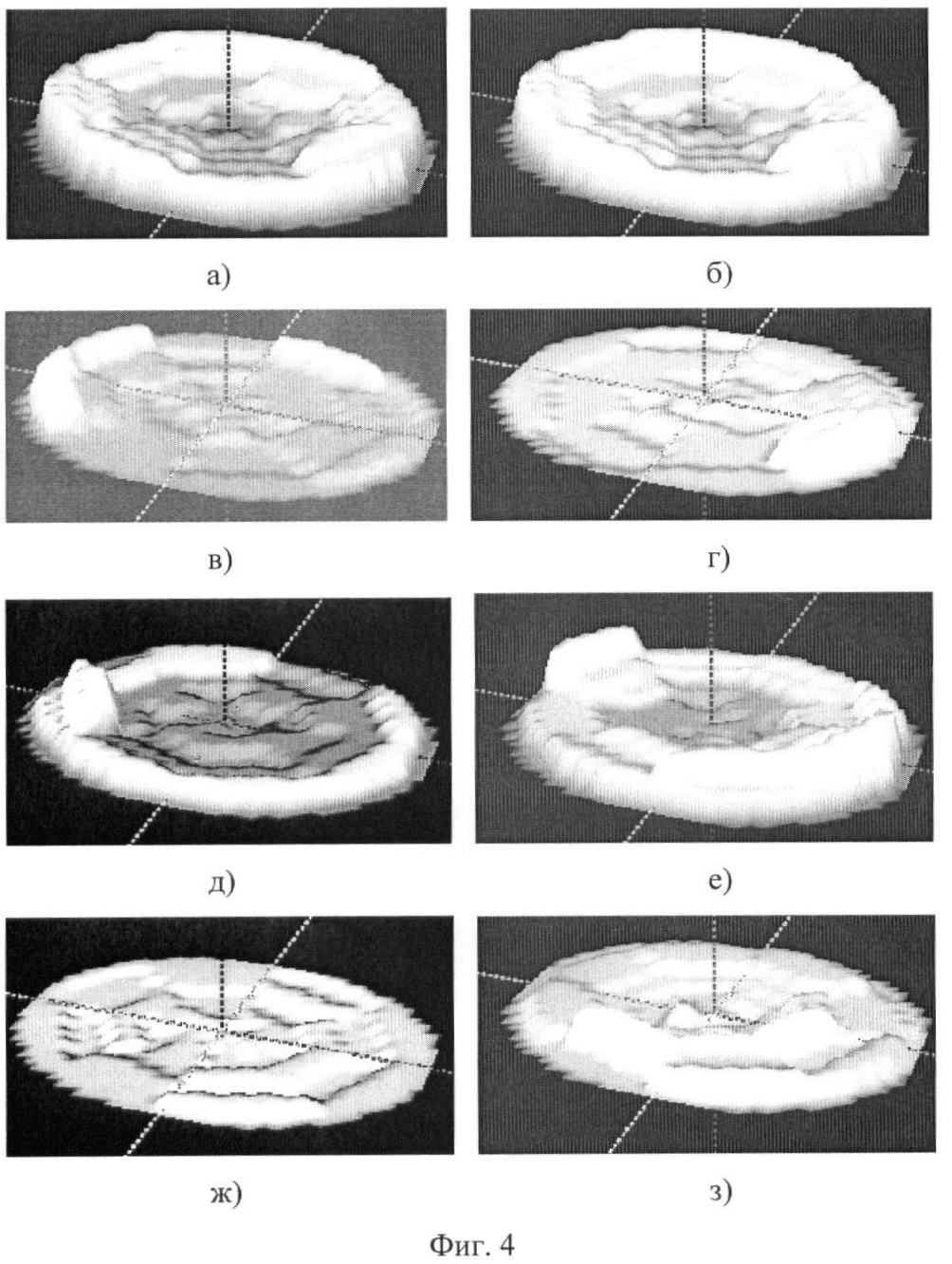 Пример 2. Пациент Н., 28 лет. Проведено измерение порогов контрастной чувствительности (Фиг.4-д – для левого глаза. Фиг.4-е – для правого глаза). Выявлено: пороги контрастной чувствительности обоих глаз снижены. Назначен курс фотостимуляции с предварительной диагностикой бинокулярных зрительных восприятий до и после каждой процедуры фотостимуляции по предлагаемым способам, 10 процедур, ежедневно, по 10 минут. Результат диагностики бинокулярных зрительных восприятий до проведения курса воздействия: феномен бинокулярного соперничества проявляется, биоритм правого глаза – 2,8 секунды, левого глаза – 4,8 секунды, соотношение биоритмов – 1,71 (отклонение от нормы), среднее значение – 3,8 секунды. Конечные длительности импульсов фотостимуляции – 3,8 секунды первые три процедуры, 3,5 секунды – вторые три процедуры, 3,2 секунды – последние 4 процедуры. В результате диагностики в конце курса: биоритм правого глаза – 3,1 секунды, левого глаза – 3,3 секунды, соотношение биоритмов – 1,06, среднее значение – 3,2 секунды. Проведено измерение порогов контрастной чувствительности после курса фотостимуляции (Фиг.4-ж – для левого глаза, Фиг.4-з – для правого глаза). Выявлено: пороги контрастной чувствительности обоих глаз в пределах нормы, что свидетельствует об улучшении зрительных функций.
