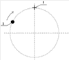 На чертеже представлена окружность, предъявляемая испытуемому на экране видеомонитора, где 1 – метка, 2 – точечный объект, движущийся с заданной скоростью по окружности.