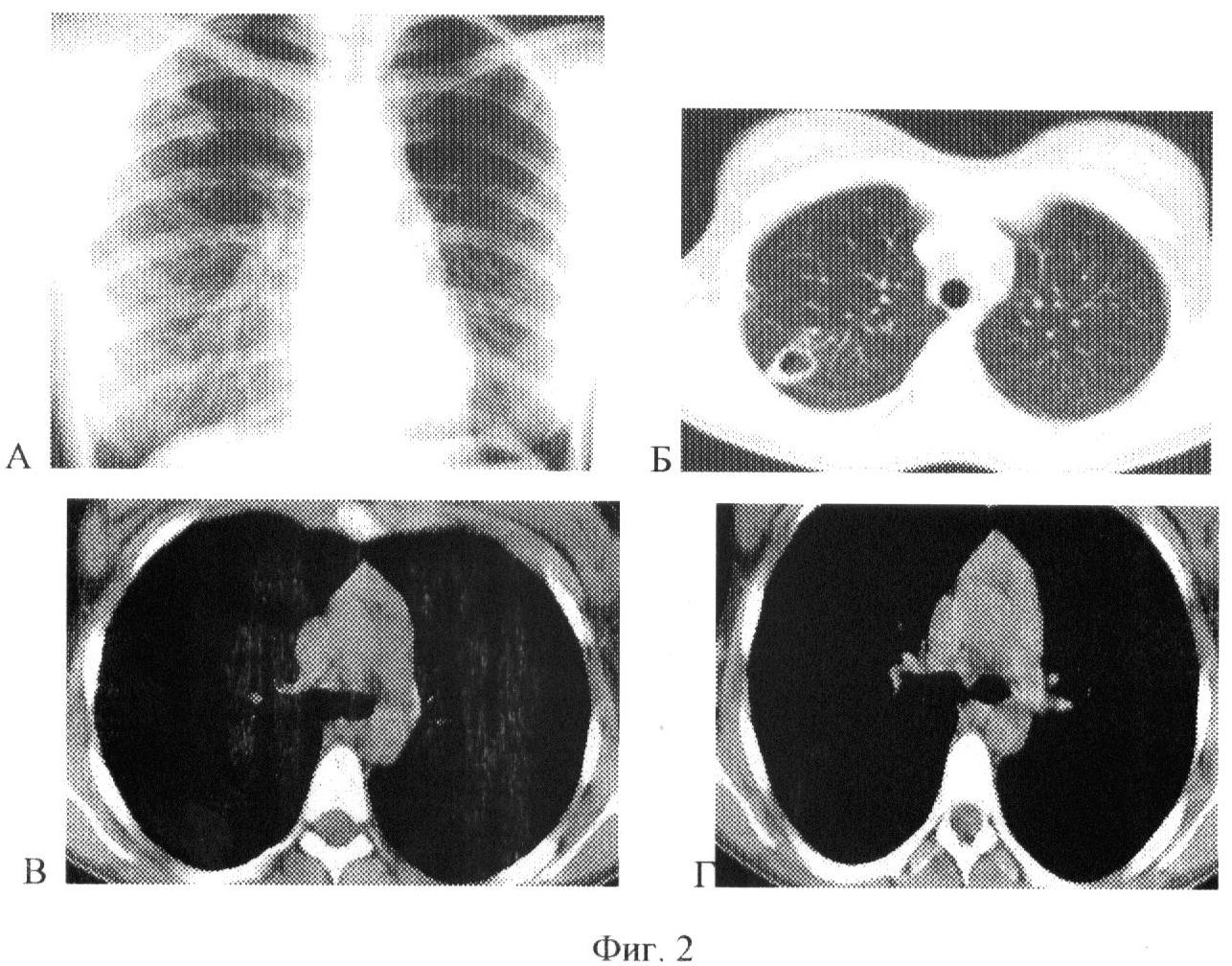 При рентгенологическом обследовании в момент поступления (Фиг.2-А, Б) определяется в верхней доле правого легкого на фоне разнокалиберных очагов полость распада (каверна) диаметром 1,8 см с неравномерно утолщенной стенкой. При СКТ (Фиг.2-В, Г) дополнительно визуализируются увеличенные лимфоузлы нижней правой паратрахеальной и бифуркационной группы до 1, 2 см. Структура лимфоузлов не изменена.