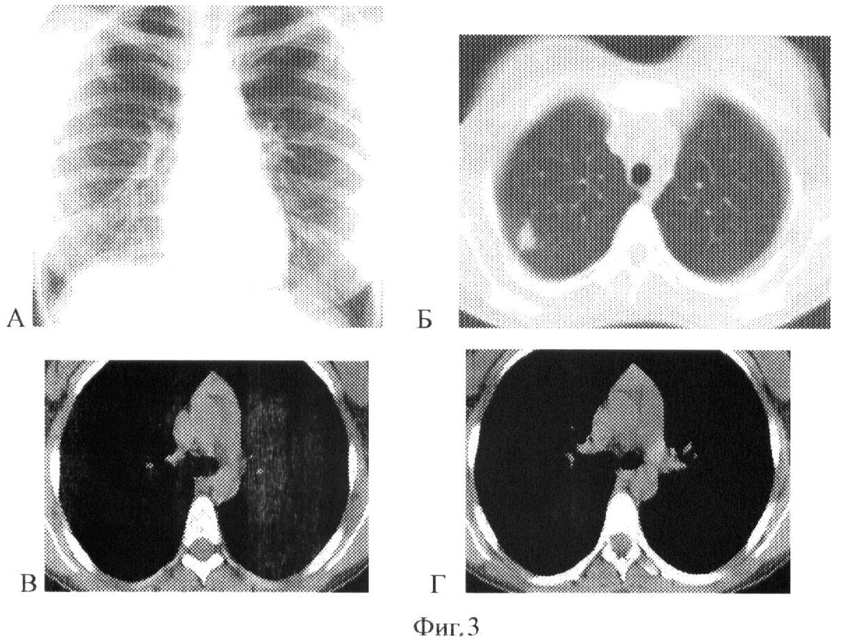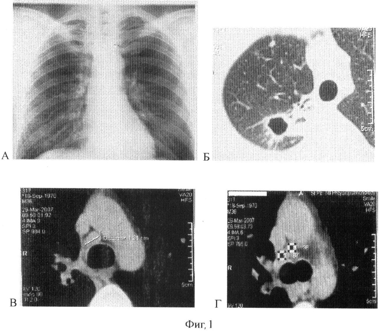 При рентгенологическом обследовании от 29.03.07 (Фиг.1-А, Б) отмечается сохранение полости распада (каверны) со сформированной стенкой в S2 правого легкого размером 2,4×3,6 см, на фоне фиброзно-перестроенного легочного рисунка и разнокалиберных очагов. Дополнительно визуализируются (Фиг.1-В, Г) увеличенные до 1,3 см в наибольшем размере лимфоузлы правой трахеобронхиальной и бронхопульмональной группы. Структура лимфоузлов неоднородна за счет участков повышенной плотности в центральных отделах лимфоузла. Неоднородность структуры позволяет сделать вывод о туберкулезном лимфадените.