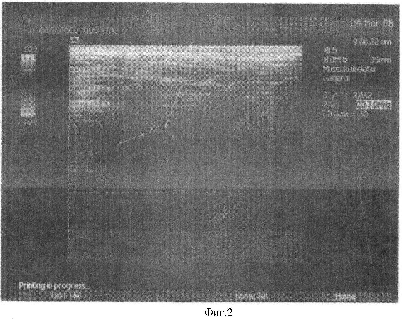 Определяют цветовой локус в проекции скуловой кости на расстоянии от поверхности кожи (1,6 см±0,2 см) (фиг.2), определяют диаметр сосуда, оценивают контуры.