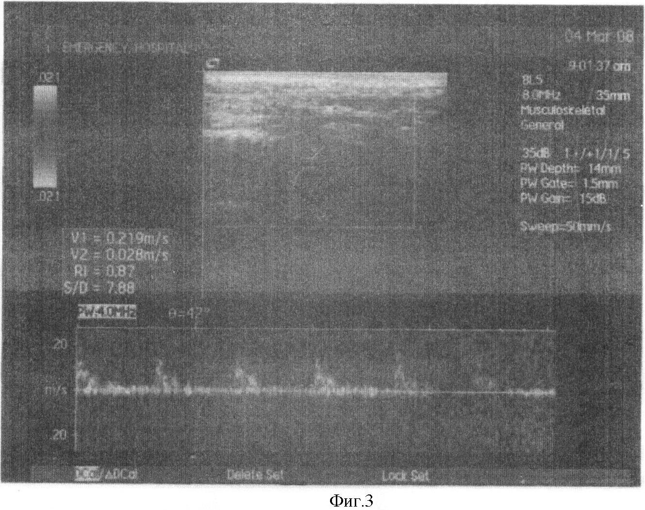 1. Пиковая систолическая скорость (Vmax) кровотока составляет 0,305±0,250 (фиг.3).