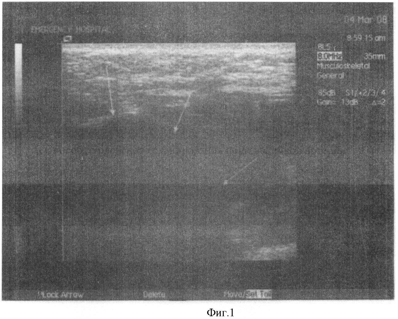 Изобретение иллюстрируется следующими фигурами: на фиг.1 изображена скуловая кость в виде тонкой гиперэхогенной криволинейной структуры толщиной 1-2 мм, на фиг.2 – цветовой локус в проекции скуловой кости, на фиг.3 – спектр допплеровского сдвига частот в импульсно-волновом режиме.
