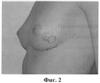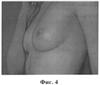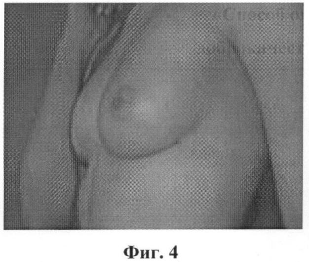 Пациентка осмотрена через 1 и 3 месяца после операции. Молочные железы без особенностей. Опухолевые образования не определяются. Послеоперационный рубец располагается в субмаммарной складке, хорошего качества, визуализируется с трудом (см. фиг.4). Полученным результатом пациентка довольна.