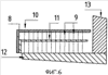 Внутри подвижной губки 4 расположен приемник 21 игл после прошивания, снабженный средством фиксации игл после прошивания (см. фиг.13 и 14). Приемник 21 игл имеет полую (предпочтительно коробчатую) форму и концы игл после прошивания попадают в него через щелевые отверстия в дне приемника 21. В приемнике 21 игл располагается средство фиксации игл. На фиг.9, 10, 11, 11а и 12 представлены четыре из возможных вариантов выполнения средства фиксации игл.