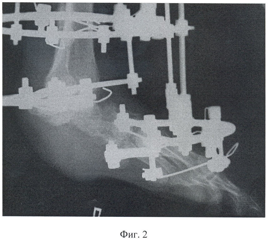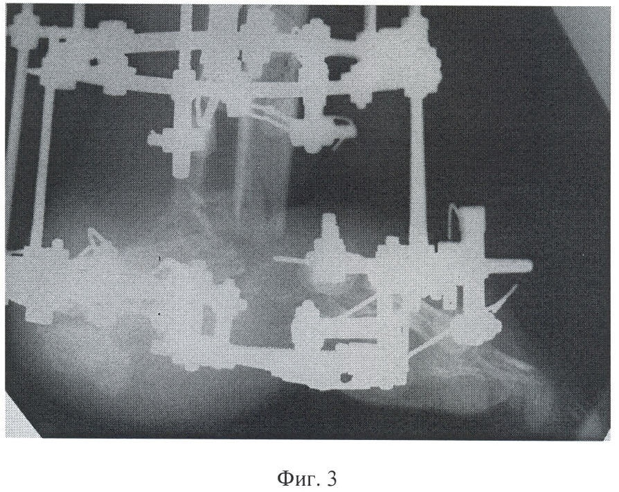 После анестезии и обработки операционного поля известными приемами осуществляют остеосинтез пораженной стопы и голени. При его выполнении фиксирующие спицы проводят на уровне проксимальной, средней и дистальной трети берцовых костей, таранной кости, кости предплюсны и плюсневые кости. В натянутом состоянии спицы крепят на устанавливаемых в их проекции опорах, которые соединяют между собой резьбовыми стержнями и шарнирными узлами с возможностью дозированного разноплоскостного перемещения.