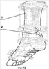 Тракцию проксимального 8 конца разорванного сухожилия выполняют в положении подошвенного сгибания стопы 2 аппаратом внешней фиксации. К диафизу большеберцовой кости 9 на границе верхней и средней ее третей на уровне мышечно-сухожильного перехода икроножной мышцы 10 прикрепляют верхнее кольцо 3 и фиксируют его двумя или тремя спицами 11. Затем на уровне проксимального конца 8 разорванного ахиллова сухожилия накладывают среднее кольцо 4 и соединяют с двумя спицами 12, которые пропускают через сухожилие на расстоянии 2-3 см от дистального края проксимального конца 8 сухожилия.