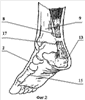 Больной И., 35 лет, обратился в клинику с разрывом ахиллова сухожилия спустя 3 дня после травмы во время игры в волейбол (фиг.13). Выполнен монтаж аппарата внешней фиксации с тракцией проксимального конца сухожилия в положении подошвенного сгибания, устранивший диастаз концов сухожилия. Область разрыва ахиллова сухожилия обнажена зигзагообразным доступом и выполнен васкуляризационный шов паратенона. Операционная рана закрыта с уменьшением натяжения за счет формирования отрезков cc’ (фиг.14). Швы сняты на четырнадцатые сутки после операции. Через пять недель после хирургического вмешательства аппарат был демонтирован. После восстановительного лечения, занявшего еще два месяца, функция нижней конечности полностью восстановилась и пациент смог вернутся к полноценным занятиям волейболом.