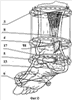 Возможен вариант постепенного уменьшения эквинуса стопы за счет использования регулируемого соединения полукольца 6 с верхним 3 или нижним 5 кольцами до достижения нейтрального положения голеностопного сустава. Аппарат внешней фиксации демонтируют через 5-8 недель после шва паратенона и приступают к разработке движений в голеностопном суставе.