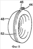 Другие варианты осуществления находятся в объеме формулы изобретения. Слухозащитное устройство может также включать ремешок в дополнение к головной дужке. Предпочтительно длина ремешка регулируется, например, за счет трения, так что ремешок помогает поддерживать наушники в нужном положении на пользователе. Ремешок может помочь поддерживать наушники в положении на пользователе, например, когда головная дужка помещена позади головы пользователя, к примеру, за шеей пользователя. Когда головная дужка помещена позади шеи, ремешок может быть помещен на голове, чтобы помочь поддерживать наушники на уровне ушей. Предпочтительно ремешок относительно тонок, чтобы пользователь мог носить головной убор (например, каску) поверх ремешка, одновременно нося наушники. Фиг.7 и 8 иллюстрируют вариант осуществления слухозащитного устройства 40, который включает в себя головную дужку 12, ремешок 42, первый наушник 50а и второй наушник 50b. Петля 46 отходит от жесткого пластмассового кольца 52, которое окружает чашу 48 для уха. Каждый конец ремешка 42 проходит через отверстие 44, образованное петлей 46 на каждой из чаш 48 для уха. Ребра 54 выступают из ремешка 42 около концов ремешков, чтобы препятствовать этим концам проскальзывать назад через отверстие 44. Ремешок 42 остается зафиксированным на месте и может регулироваться путем перемещения с усилием ребра 54 через отверстие 44 в соответствующем направлении. Любой подходящий материал может использоваться для ремешка, в том числе, к примеру, эластичный, пленочный (например, пластмассы, т.е. полимеры, пленки) и их комбинации. Хотя элемент 52 описан как отдельный компонент в форме жесткого пластмассового кольца, элемент 52, включая петлю 46, может быть одновременно сформирован в форме, используемой для формирования наушника или чаши для уха и может быть сделан от того же самого материала, что и наушник или чаша для уха.