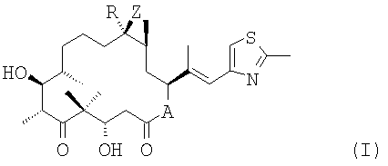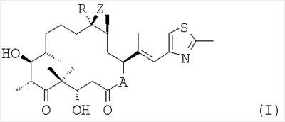 Соединение формулы I, в которой А представляет собой О, R означает водород и Z означает О, известно как эпотилон А; соединение формулы I, в которой А представляет собой О, R означает метил и Z означает О, известно как эпотилон В; соединение формулы I, в которой А представляет собой О, R означает водород и Z означает связь, известно как эпотилон С; соединение формулы I, в которой А представляет собой О, R означает метил и Z означает связь, известно как эпотилон D.