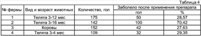 При гельминтологических исследованиях на телязиоз были получены отрицательные результаты. Исследования на микоплазмоз и хламидиоз серологическими методами, также не выявили реагирующих животных. Для определения эффективности профилактики и лечения кератоконъюнктивитов были сформированы 4 опытных группы телят до 3-х месячного возраста. Лечение 1 группа (контрольная) – эхинацея композитум, в/мышечно, 1 мл / 100 кг живой массы, 1 раз в день, 5-7 дней подряд; энгистол в/мышечно, 1 мл / 100 кг живой массы, 1 раз в день, 5-7 дней подряд (n=40); (лечение, как в прототипе). 2 группа – препарат «Керавит», внутримышечно (для телят до 80 кг живой массы 1-2 мл / 10-15 кг живой массы и повторно в той же дозе через 3-5 дней (n=20). Лечение телят 1-2-й групп осуществляли при появлении первых признаков заболевания (слезотечение, покраснение конъюнктивы). Проведенное лечение показало, что применение гомеопатического препарата предотвращает помутнение роговицы глаза, купируя поражения глаз на стадии кератоконъюнктивита, начиная уже с 10-го дня лечения (таблица 2). В это же время в первой группе отмечали поражения в виде помутнения роговицы глаза на 10 день у 15-22% телят, на 15-й день – у 20-27,5 и на 21-й день лечения – у 25-30% больных телят. Телят с признаками кератоконъюнктивита в 2-й группе по сравнению с контрольной (группа 1) на 10-й день лечения было меньше на 30%, на 15-й день – на 15%, к 21-у дню – на 17,5% соответственно. Таким образом, лечение инфекционного кератоконъюнктивита препаратом «Керавит» оказалось более эффективными по сравнению с традиционной схемой лечения. Пример 2. Профилактический эффект применения препарата «Керавит» проводили на крупном рогатом скоте различного возраста. В одном из хозяйств в течение года регистрировались массовые заболевания молодняка крупного рогатого скота с клиническими признаками катарального, гнойно-катарального конъюнктивита. Применение препарата «Керавит» телятам (с массой до 80 кг) с профилактической целью за 3-5 дней до предполагаемого появления первых клинических признаков болезни в дозе 1 мл / 10 кг живой массы животного, п/кожно, двукратно с интервалом 3-5 дней, и коровам с профилактической целью за 3-5 дней до предполагаемого появления первых клинических признаков болезни в дозе 1 мл /100 кг живой массы животного, п/кожно, двукратно с интервалом 3-5 дней оказал профилактический эффект (табл.3).