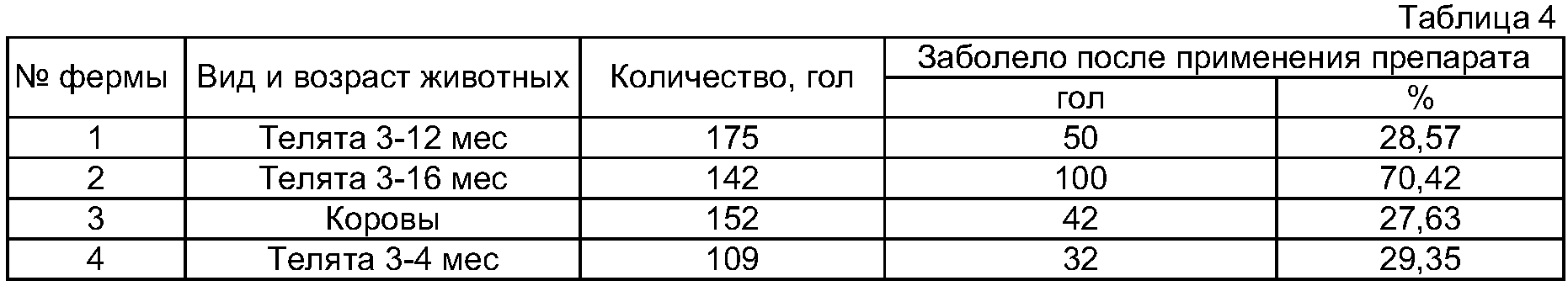 Изобретение относится к области ветеринарии, в частности к средствам и способам лечения кератоконъюнктивита крупного рогатого скота. Препарат для лечения и профилактики инфекционного кератоконъюнктивита крупного рогатого скота включает водный раствор Sulfur, Echinacea purpurea, Hepar sulfur, Belladonna albus, Apis melifelica и тканевого нозода при следующем соотношении компонентов, мас.%: Belladonna albus С6 – 10, Sulfur С6 – 20, Echinacea purpurea С6 – 10, Apis melifelica С6 – 30, Hepar sulfur С6 – 15, тканевой нозод D6 – 15. Способ лечения и профилактики инфекционного кератоконъюнктивита крупного рогатого скота включает внутримышечное введение указанного препарата телятам, коровам и нетелям 1 раз в день с интервалом 3-5 дней, причем телятам до 80 кг живой массы препарат вводят в дозе 1-2 мл/10-15 кг живой массы, а коровам и нетелям – в дозе 1-2 мл/100 кг живой массы. Препарат и способ обладают высокой терапевтической эффективностью по сравнению с аналогами. 2 н. и 2 з.п. ф-лы, 4 табл.