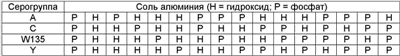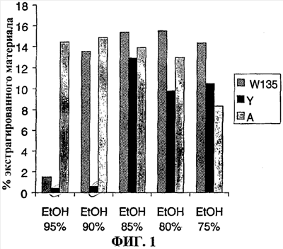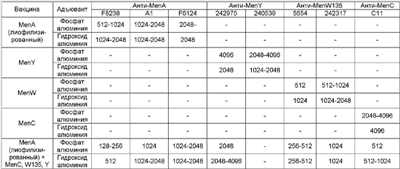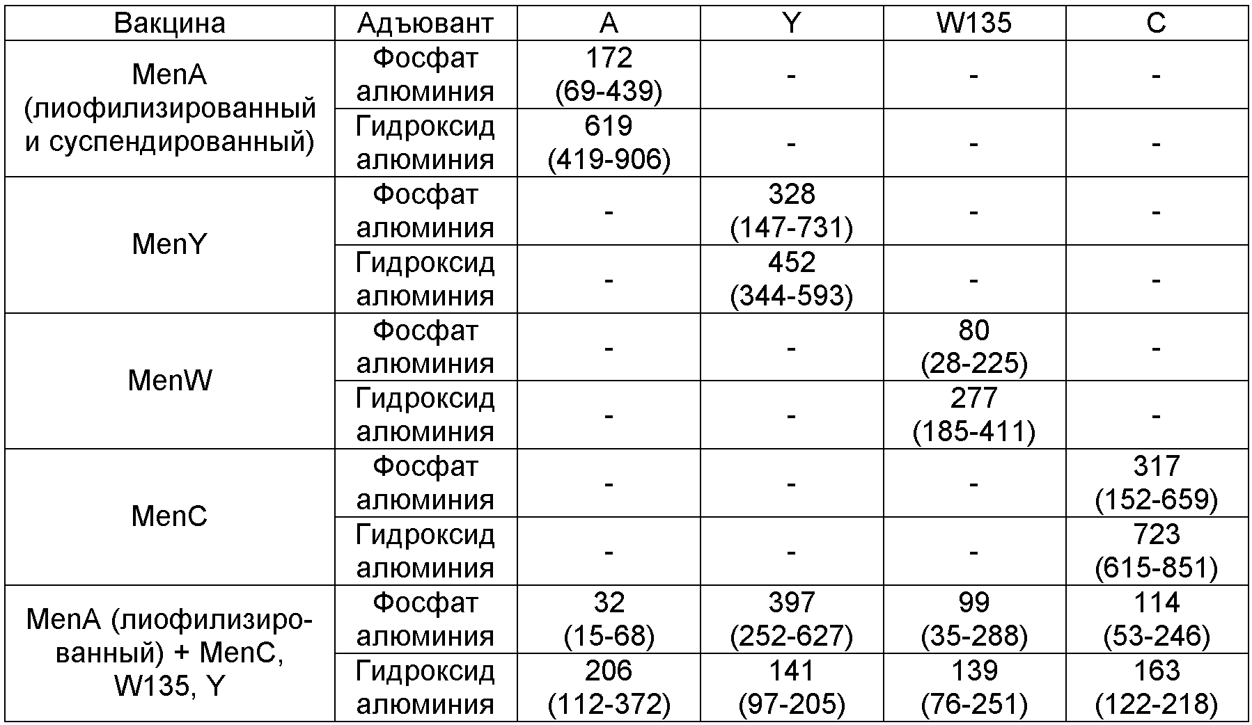 В случае, когда смесь включает капсулярные сахариды (например, олигосахариды) из серогруппы W135 и по меньшей мере из одной из серогрупп А, С и Y, неожиданно было установлено, что иммуногенность сахарида MenW135 выше, когда его вводят в комбинации с сахаридом (сахаридами) из другой серогруппы (серогрупп), чем когда его вводят в отдельности (в той же дозировке и т.п.) [сравн. со ссылкой 58]. Таким образом, способность антигена MenW135 вызывать иммунный ответ больше, чем иммунный ответ, вызываемый эквивалентным количеством того же самого антигена после введения без ассоциации с антигенами из других серогрупп. Указанная усиленная иммуногенность может быть установлена путем введения антигена MenW135 контрольным животным, а смеси – экспериментальным животным, и сравнения титров антител против указанных двух с использованием стандартных анализов, таких как бактерицидные титры, радиоиммунный анализ и анализы ELISA и т.п. Вакцины, включающие синергические комбинации сахаридов из серогруппы W135 и других серогрупп, имеют преимущества в иммунологическом смысле. Они позволяют усилить анти-W135 ответы и/или уменьшить дозы W135.