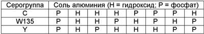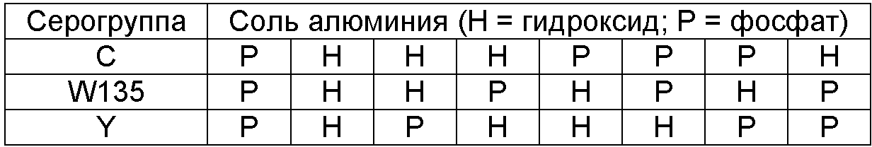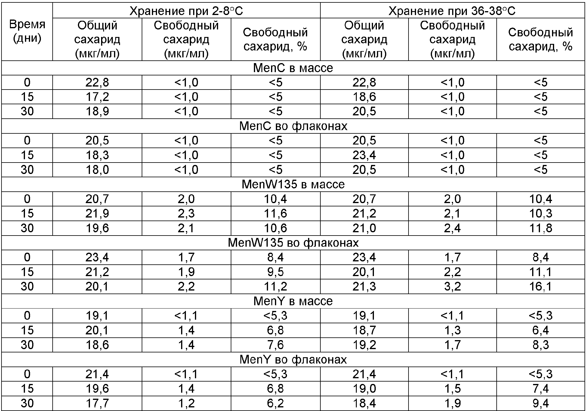 Предпочтительными соотношениями (масс./масс.) для сахаридов из серогрупп A:C:W135:Y являются: 1:1:1:1, 1:1:1:2, 2:1:1:1, 4:2:1:1, 8:4:2:1, 4:2:1:2, 8:4:1:2, 4:2:2:1, 2:2:1:1, 4:4:2:1, 2:2:1:2, 4:4:1:2 и 2:2:2:1.